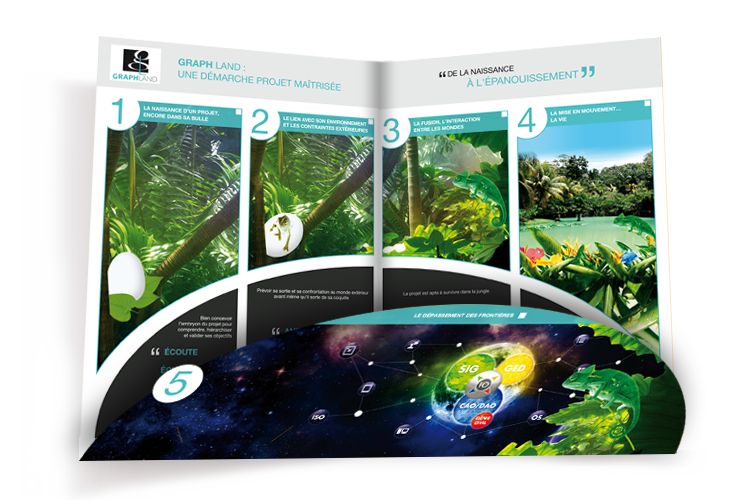 Conception d'une pochette avec forme de découpe présentant la démarche projet de Graphland.