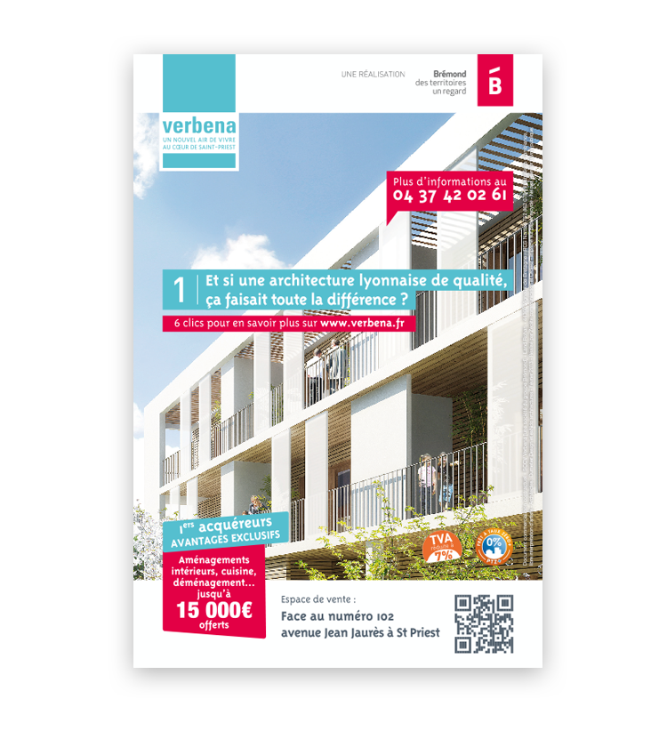 La résidence Verbena, ensemble immobilier réalisé par le groupe Brémond, propose un nouvel air de vivre ensemble, au coeur de Saint-Priest : conception bioclimatique, appartements lumineux, larges balcons et beaux espaces communs. Les constructions sont labellisées BBC (Bâtiment Basse Consommation).